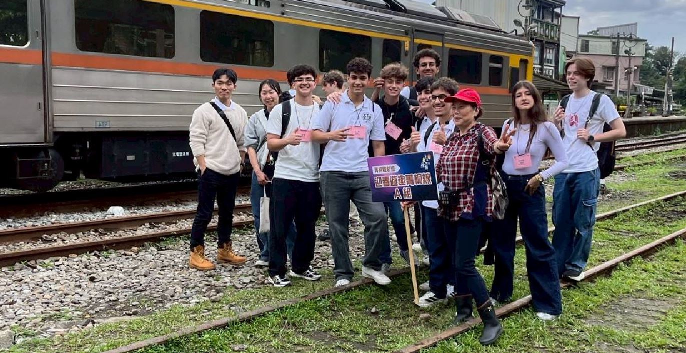▲楊桂馨(右3)於今年天燈節為外籍交換生導覽菁桐女路。(圖/新北市社會局 提供)