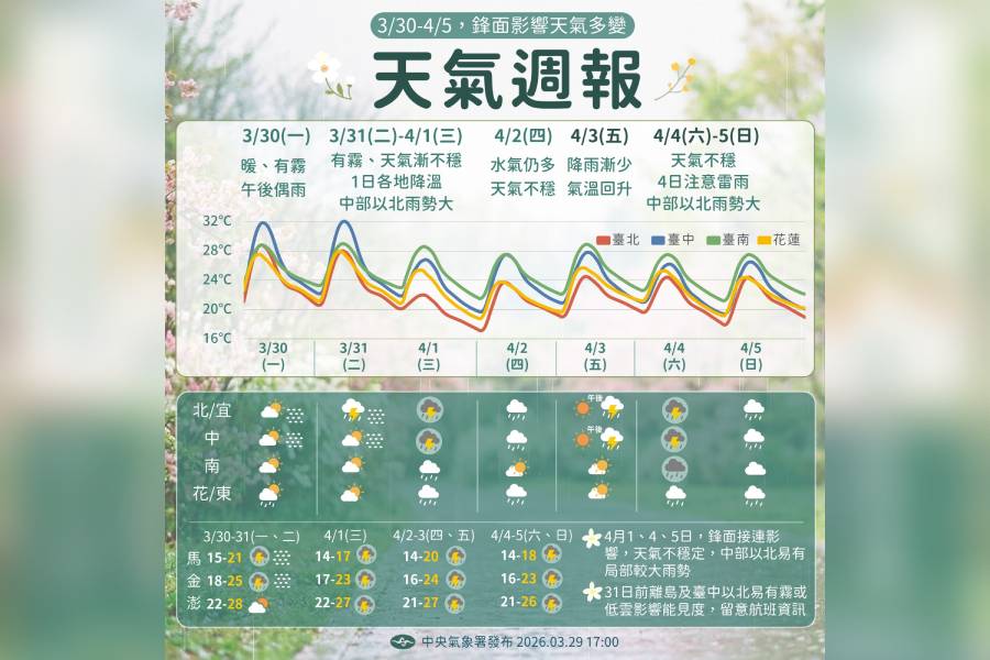 4/1(三)因鋒面通過及東北季風增強,各地天氣轉趨不穩,離島及北臺灣、中部地區有雷雨,清晨至上午中部以北更要注意局部較大雨勢,溫度上也略轉涼,沿海離島風力增強、浪增大。4/2(四)鋒面雖遠離,但華南水氣仍多,天氣仍不穩定,離島、中部以北及東半部地區有局部短暫陣雨,南部地區為多雲,溫度上因東北季風減弱,北臺灣溫度略回升。