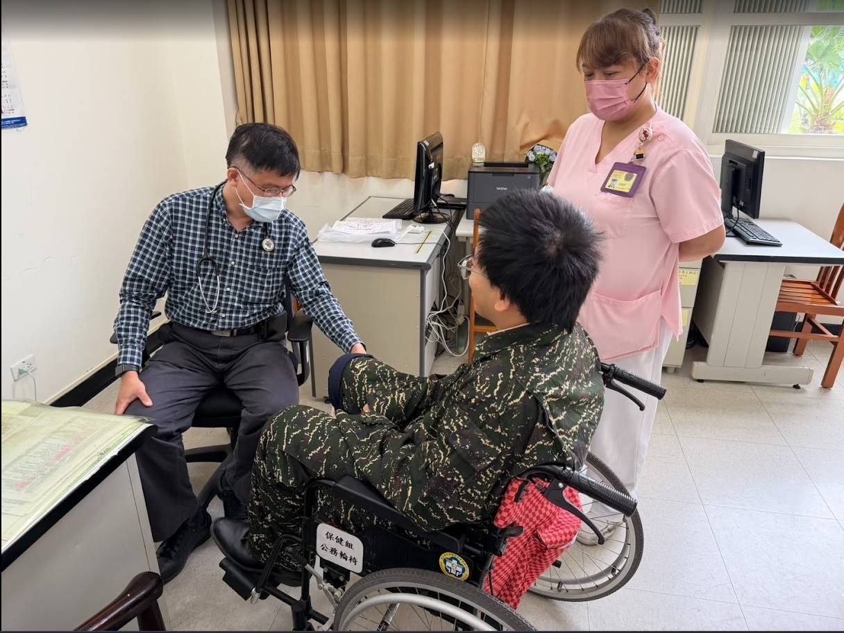 本次演練模擬2名戰況穩定傷兵(分別為右前臂二度燒燙傷及右大腿骨折術後)由國軍花蓮總醫院後送至榮家。演練過程中,首先由醫院與榮家護理人員採「ISBAR」標準化交班機制,確保病情與治療資訊完整銜接;隨後由醫師、護理師、堂長及社工組成跨專業團隊,迅速完成身心評估、用藥評估及整體照護規劃。確認狀況後,由照服員轉送與安置,並同步提供環境介紹及心理支持,確保整體收容流程順暢、不中斷。
