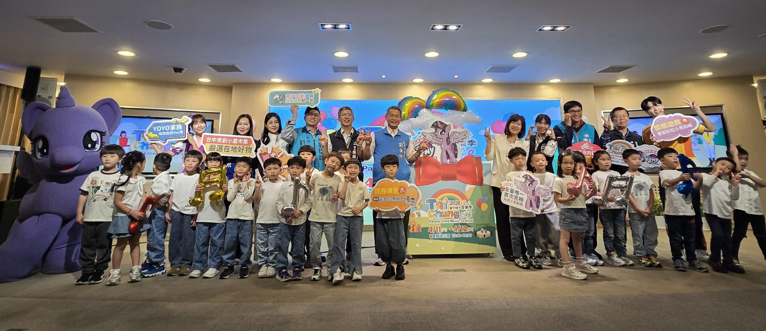 台中市政府新聞局今(1)日舉行記者會,宣布「2026台中親子音樂季」活動開跑。新聞局長欒治誼表示,4月是充滿溫馨與歡樂的月份,適逢兒童節,市府每年都全力以赴舉辦親子音樂季,在市長盧秀燕的鼓勵與支持下,今年活動規模再升級,首度攜手全球知名IP「彩虹小馬」,於4月11日至12日在夏綠地公園打造全台首座5公尺高大型氣偶拍照區,邀請親子合影留念,還有獨家限量小禮可以帶回家。今日記者會邀請YOYO家族南瓜哥哥、天竺鼠姐姐與幼彩幼兒園小朋友熱情開場,帶來活力舞蹈揭開序幕,「彩虹小馬」人氣角色「紫悅」驚喜現身並一起完成啟動儀式,現場氣氛熱絡。