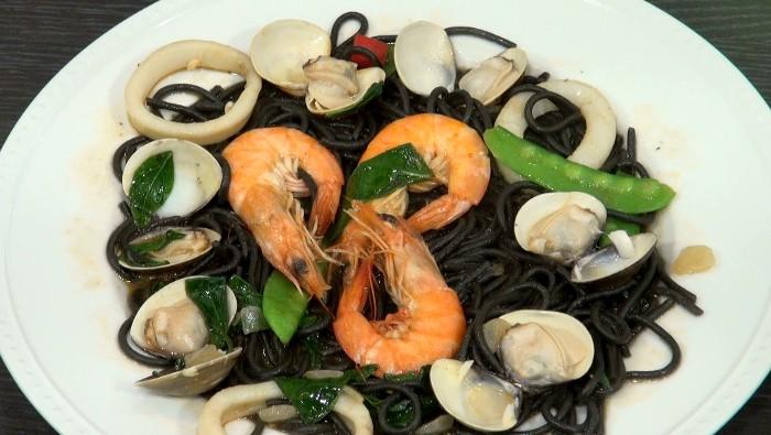 走進廚房,熱鍋翻炒聲此起彼落,師傅將新鮮海鮮下鍋快炒,搭配九層塔與墨魚麵拌炒,香氣層層堆疊,展現濃郁的義式風味。另一道人氣餐點「松子青醬蛤蜊義大利麵」,以羅勒製成的青醬為基底,融合蛤蠣鮮味,口感滑順清新,是許多老顧客的必點經典。除此之外,融合多國風味的「義式咖哩蘑菇雞肉義大利麵」,結合日式與印度元素,也成功吸引喜愛創新口味的消費者。