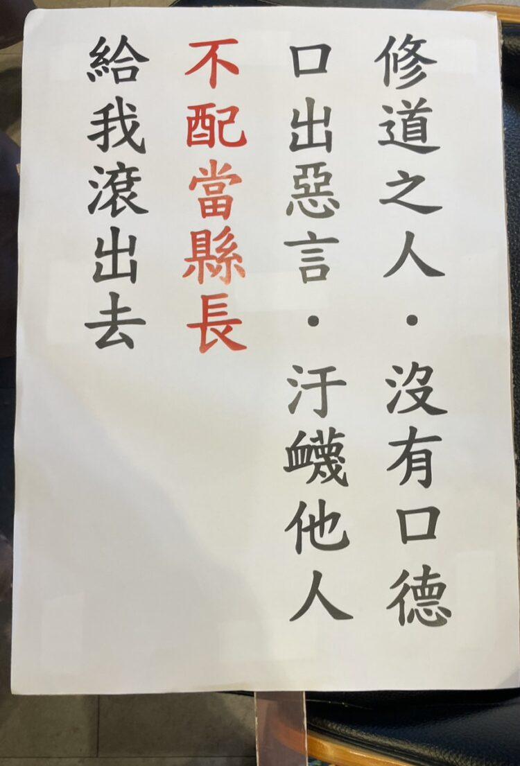 「修道之人,沒有口德。口出惡言,污衊他人。不配當縣長,給我滾出去!」其中「不配當縣長」這5字,還特別印成紅色的,疑似就是要針對已經在縣長提名初選勝出的徐欣瑩,想在她來參加黨團會議跟黨籍議員致意時,向她表達基層的不滿聲浪。