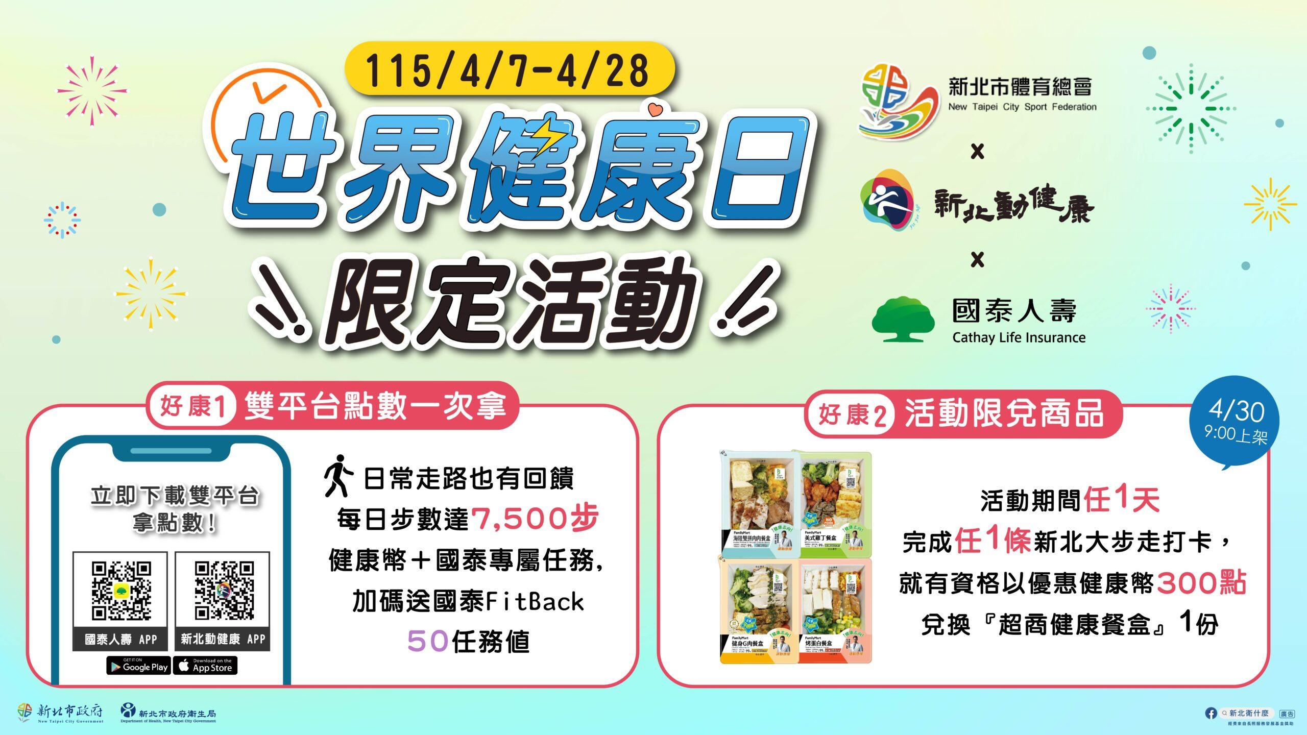 為響應4月7日「世界健康日」,在新北市體育總會大力推動全民運動風氣的引領下,新北市衛生局整合「新北動健康」平台資源,攜手國泰人壽推出「雙平台回饋」,鼓勵市民培養規律運動習慣,將運動融入日常生活,打造健康生活型態。