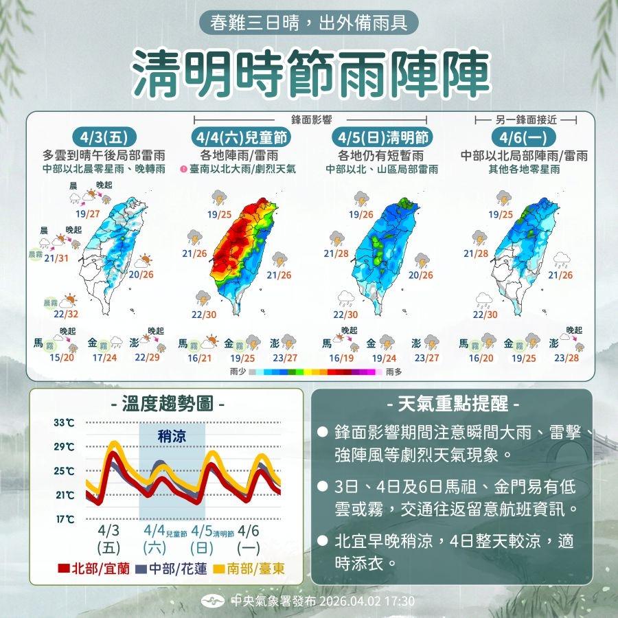 4/4兒童節(六)受鋒面影響,雨勢最明顯,各地易有陣雨或雷雨,尤其臺南以北地區,得注意局部大雨、有組織對流系統伴隨的雷擊、強陣風(尤其沿海、離島澎湖等區域;溫度上,下雨時稍降溫,北宜舒適稍涼,高溫約23~25度,其他26~30度。提醒天候不佳時,可能路面溼滑、能見度低,行車注意安全,戶外/郊外/山區活動也要小心腳步,必要時尋找掩蔽。