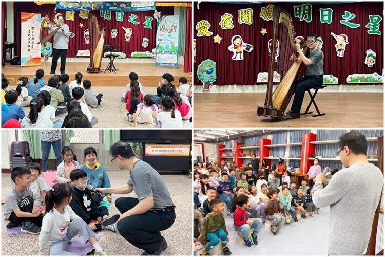 正聲台中台「聲動傳愛—琴人抱豎」公益之旅,4月1日前進苗栗縣公館鄉開礦國小與南河耶拿實驗小學。「豎琴獵人」李哲音彈奏一首首耳熟能詳的樂曲,帶給偏鄉學子優質的音樂饗宴,也讓小朋友們近距離認識這項流傳近三千年的樂器。
