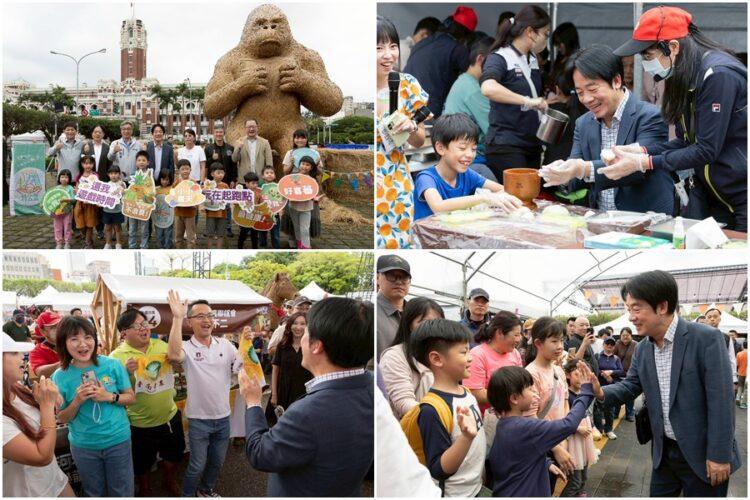 總統賴清德3日下午出席「凱道農玩節 Good R Good Day」活動,與小朋友一同製作麻糬,並參觀蔬果迷宮及稻草藝術裝置,與民眾及小朋友們親切互動。
