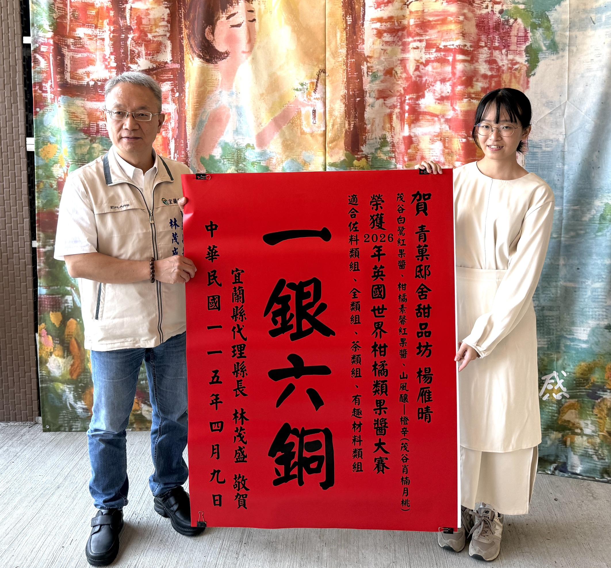 宜蘭農產加工再傳捷報。宜蘭在地品牌「青菓邸舍甜品坊(Cing Guo Dessert)」於國際知名賽事The World’s Original Marmalade Awards & Festival中表現亮眼,由果醬研發職人楊雁晴以3項創新作品勇奪1銀6銅,成功將宜蘭特色農產推向國際,宜蘭縣代理縣長林茂盛9日親頒紅榜表達祝賀,肯定其在農產加工創新與品牌行銷上的傑出表現。