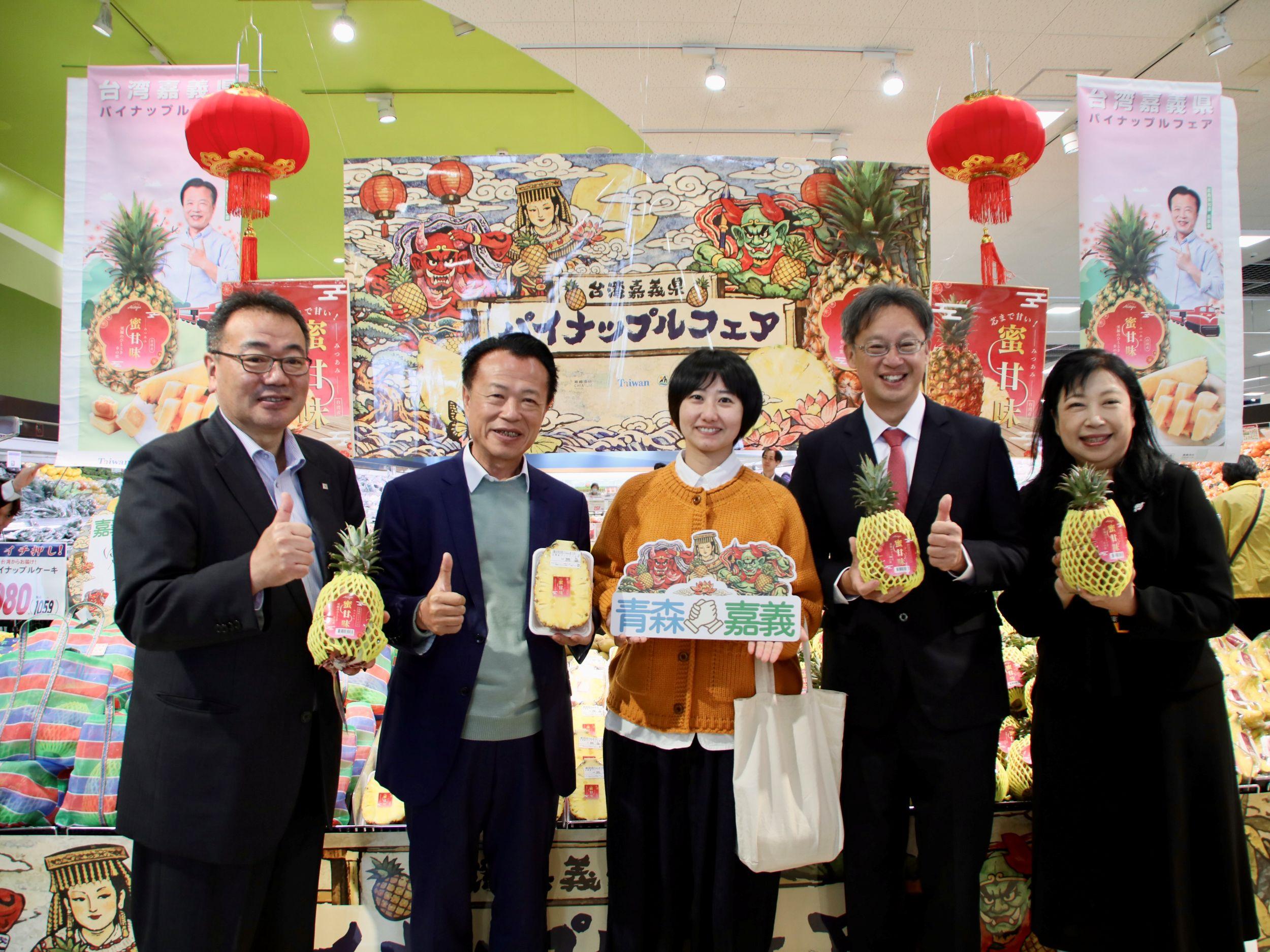 嘉義金鑽鳳梨(日本品牌名「蜜甘味」)正式打入日本東北市場,成功上架Universe超市,並於今(10)日在三澤堀口店舉辦「嘉義優鮮-鳳梨嘉年華」揭幕記者會,嘉義縣長翁章梁、Universe青果部長田名部秀治、船昌商事株式會社代表、台農發公司董事長唐淑華,以及打貓果菜生產合作社主席陳映延等人,親自到場見證此一重要時刻。