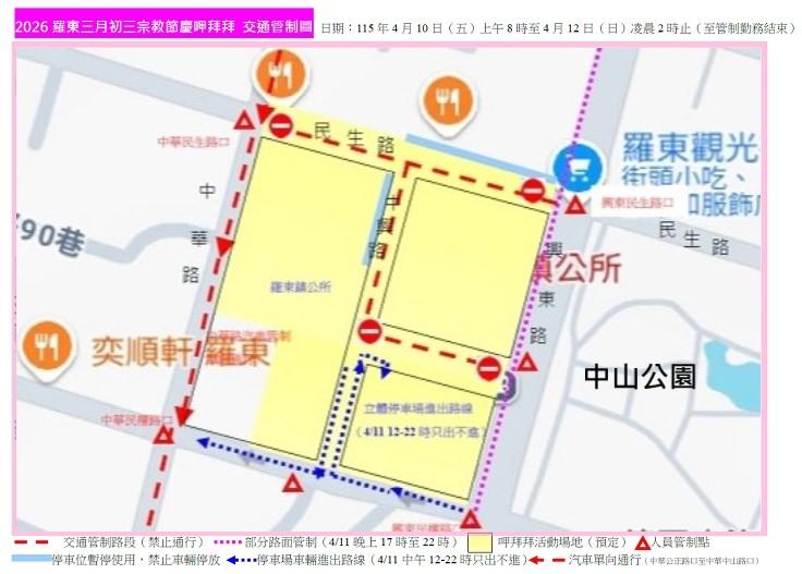 羅東鎮公所舉辦三月初三呷拜拜,周邊交通將管制,管制時間自4/10日上午8時至4/12凌晨2時止。