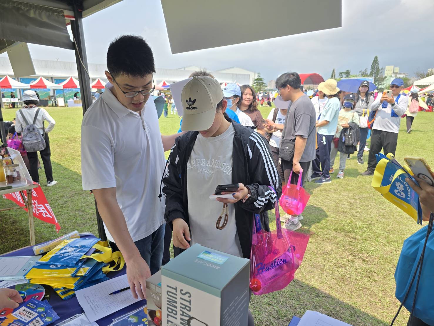 ▲花蓮縣政府觀光處設攤宣導光電加速計畫,吸引民眾大排長龍索取贈品。