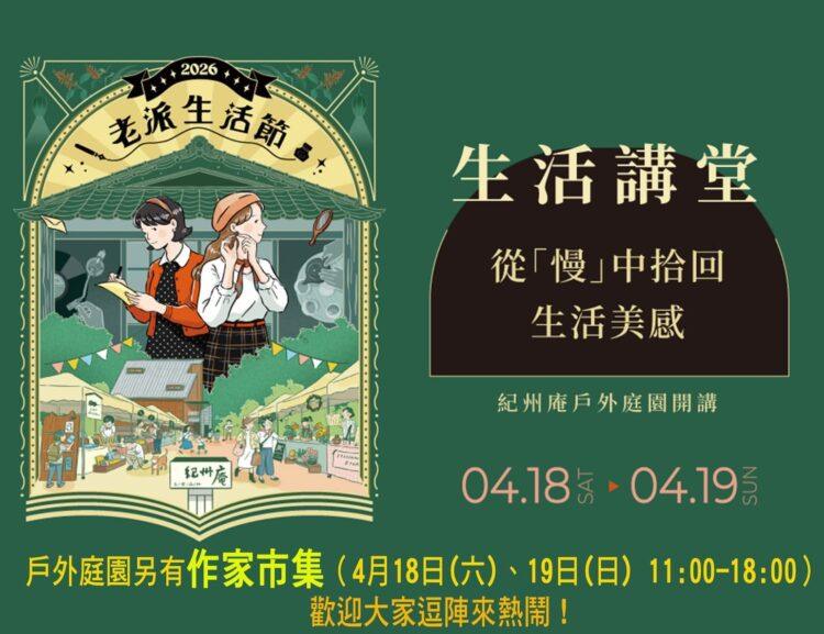 主辦單位表示,本次生活講堂四場活動皆於紀州庵戶外庭園舉行,採自由入場方式,無需事先報名,惟座位有限,建議民眾提早到場。此外,4月18日與19日11時至18時,現場亦同步舉辦作家市集,結合閱讀與生活風格,打造多元文化場域。