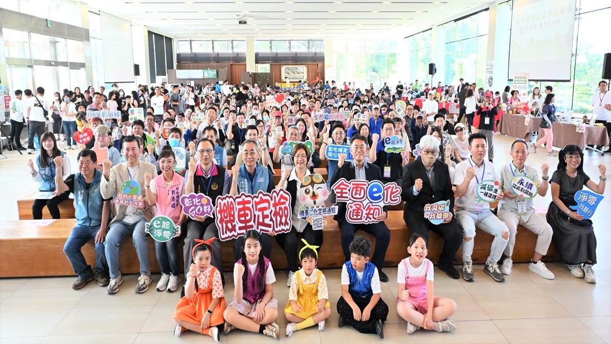 為響應國家2050淨零排放政策,彰化縣政府與成美文化園、頂新和德文教基金會、彰化縣機車商業同業公會、臺灣智慧移動產業協會等單位合作,於今(12)日上午在成美文化園舉辦「彰化縣環保淨零嘉年華 e起淨零彰化GO好」活動,吸引逾千名親子熱情參與。彰化縣長王惠美與現場貴賓,一同攜手大小朋友投入淨零轉型行動,展現全民參與的行動力。
