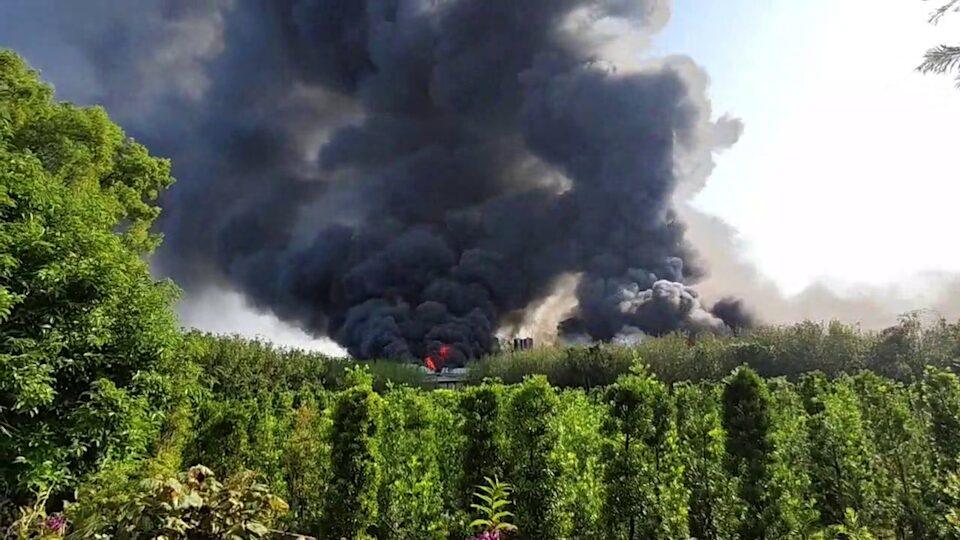 據了解該間成衣代工廠經營30多年,不明原因早上7點多突然從廠區竄出濃煙,沒過多久就全面燃燒,整間鐵皮工廠陷入火海,烈焰伴隨黑色濃煙不斷往上竄,畫面怵目驚心,鄰近的社頭、田中等地民眾都清楚看到濃煙。
