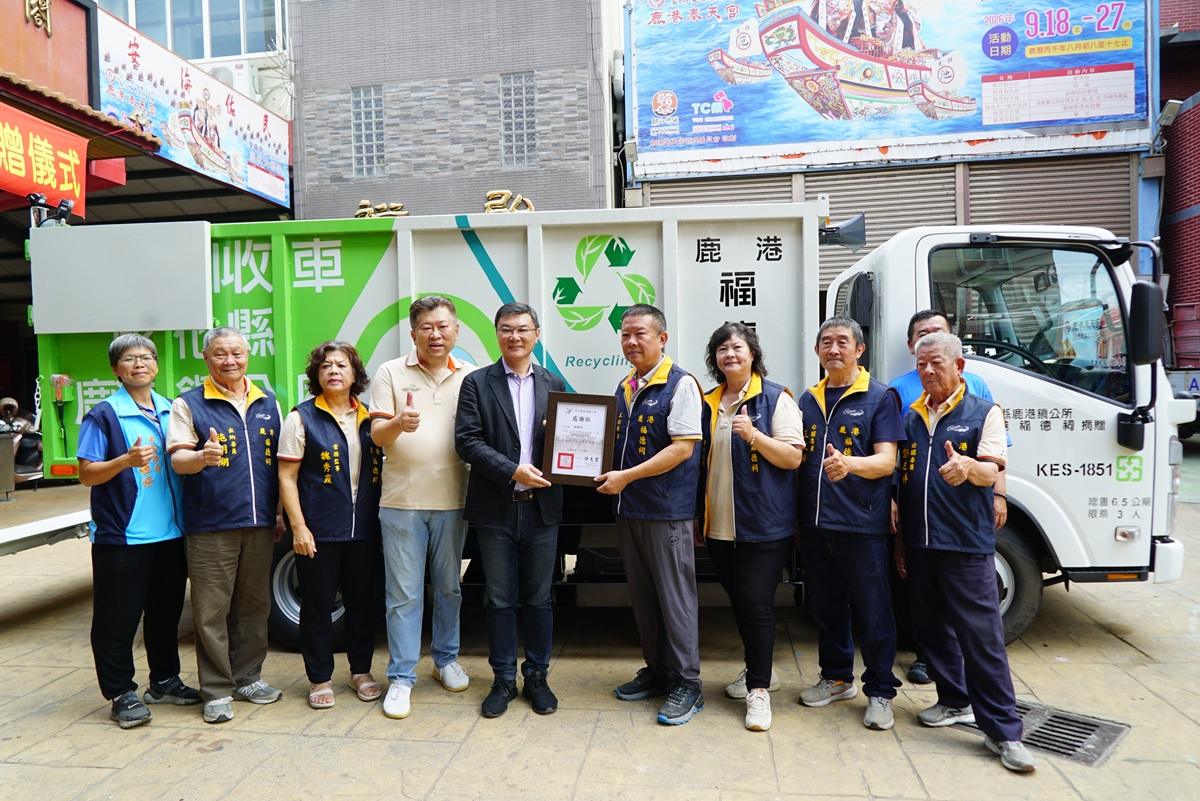 鹿港福德祠管理委員會主委施炳坤表示,有鑑於鹿港清潔隊對於地方垃圾處理清運的辛勞,特地購贈一台「6.5噸升降尾門傾卸式資源回收車」,這台資源回收車,配備有液壓升降尾門與自動傾卸功能,不僅能大幅降低清潔人員搬運回收物的負擔,並縮短作業時間,讓資源回收流程可以有效提高更效能。