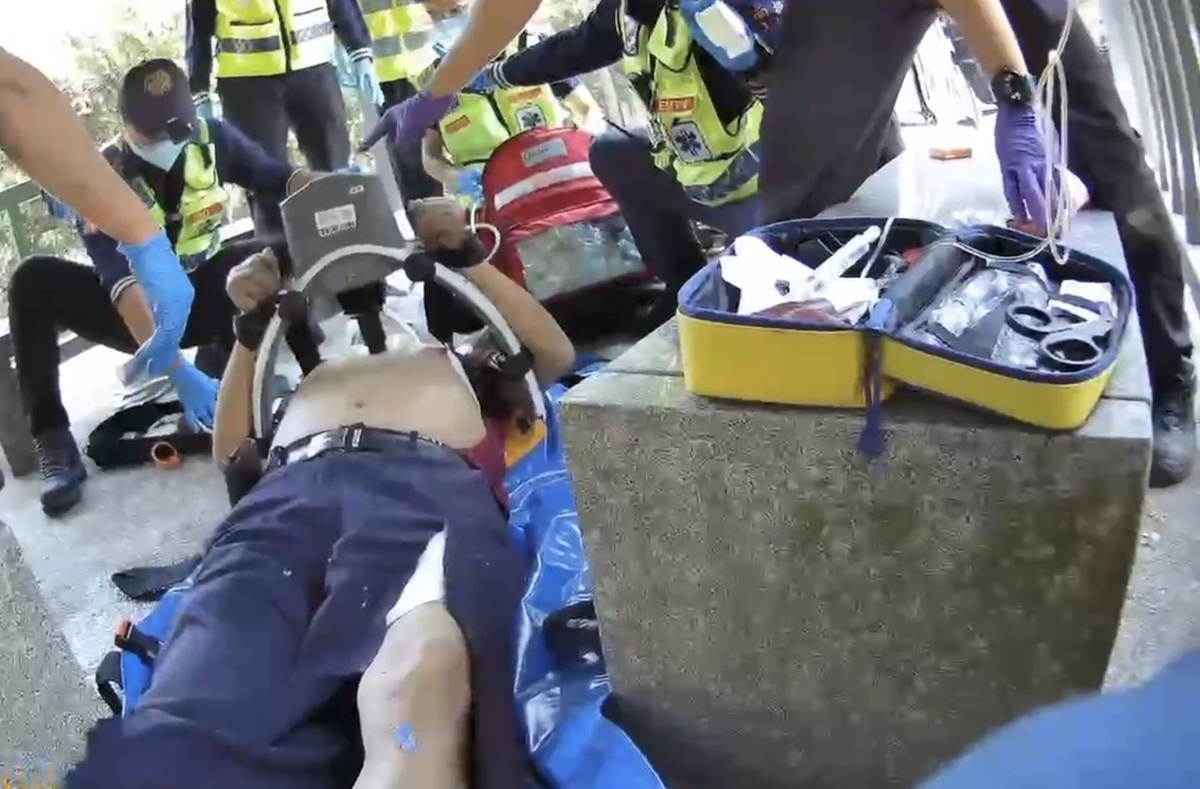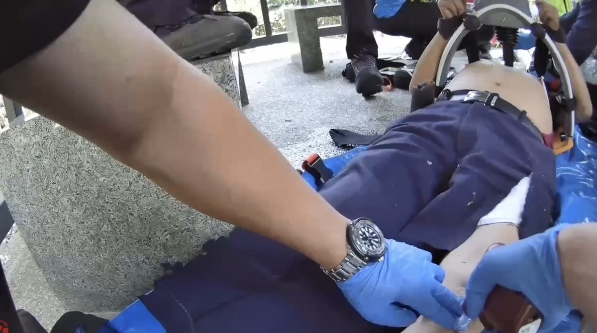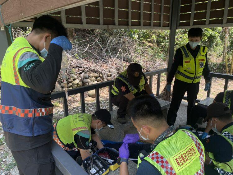 日前南投縣政府消防局119勤務中心首先接獲報案,稱芬園鄉挑水古道有民眾倒地。現場友人第一時間撥打119求救,並在派遣員的指導下立即實施心肺復甦術(CPR)。消防局考量患者可能需要長距離搬運,因此派遣3輛救護車及9名救護技術員出勤。由於轄區位於彰化縣,因此立刻轉報彰化縣消防局,得知為OHCA患者,彰化縣也立刻派遣芬園分隊1名高級救護技術員及2名救護技術員出勤,形成現場12位救護人員聯手急救1位患者的特殊場景。