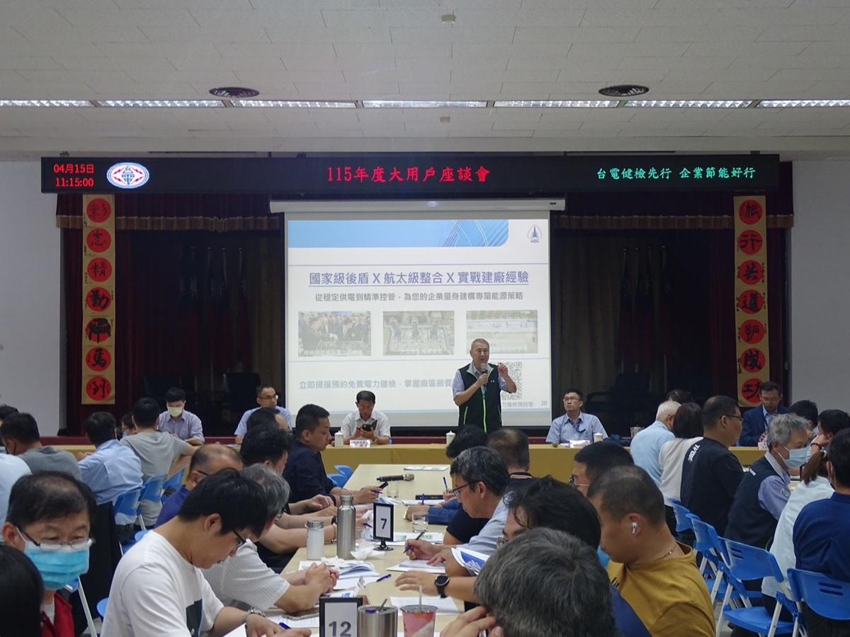 本次座談會除宣導深度節能政策、高壓用戶設備維護及加速復電程序,以及69kV以上特高壓大用戶運轉機制及設備維護管理外,也針對115年業務重點措施進行說明,包括線路設置費調整、各類電價選用及需量反應負載管理措施等內容;本次也特別邀請漢翔航空工業股份有限公司以實際案例分享儲能系統如何配合政府用電大戶條款、深度節能政策及ESG永續需求,提供用戶作為未來設備投資與能源規劃參考。另延續往年深受好評的桌邊服務模式,由服務專員與大用戶面對面交流,即時解答與建議,協助用戶選擇最適合自身生產需求的電價方案與用電策略,共創雙贏。