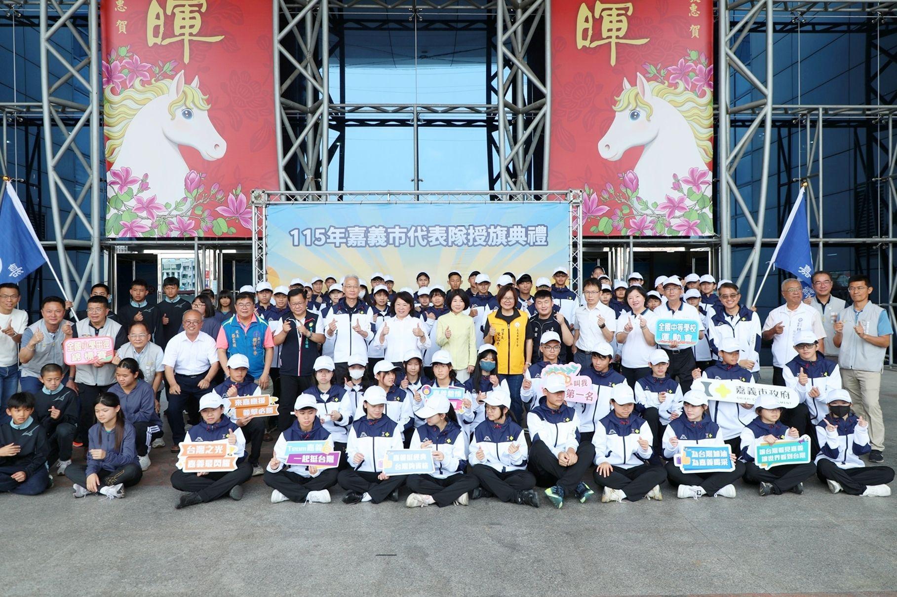 嘉義市運動健兒全力備戰全國級別賽事,嘉義市政府今(15)日舉行「115年全國中等學校運動會暨全國小學田徑錦標賽」聯合授旗典禮,由嘉義市長黃敏惠授旗予嘉義家職角力常勝軍湯昔恩選手及田徑小將宣信國小林欣妤選手,象徵嘉義市代表隊正式出征。同時致贈每位選手加菜金與慰勞水果,為選手們注入滿滿能量,期勉大家以最佳狀態迎戰,勇敢追夢、再創巔峰。