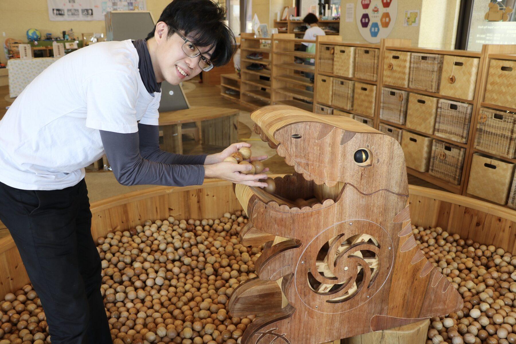 新北市玩具銀行旗艦店玩聚窩有一隻恐龍造型的水車「龍之助」,牠喜歡吃木球,配上偌大的木球池,成為小朋友的最愛,餵牠圓圓的木球,牠肚子就會發出咕嚕咕嚕的聲音,小朋友愛不釋手,成為鎮店之寶。