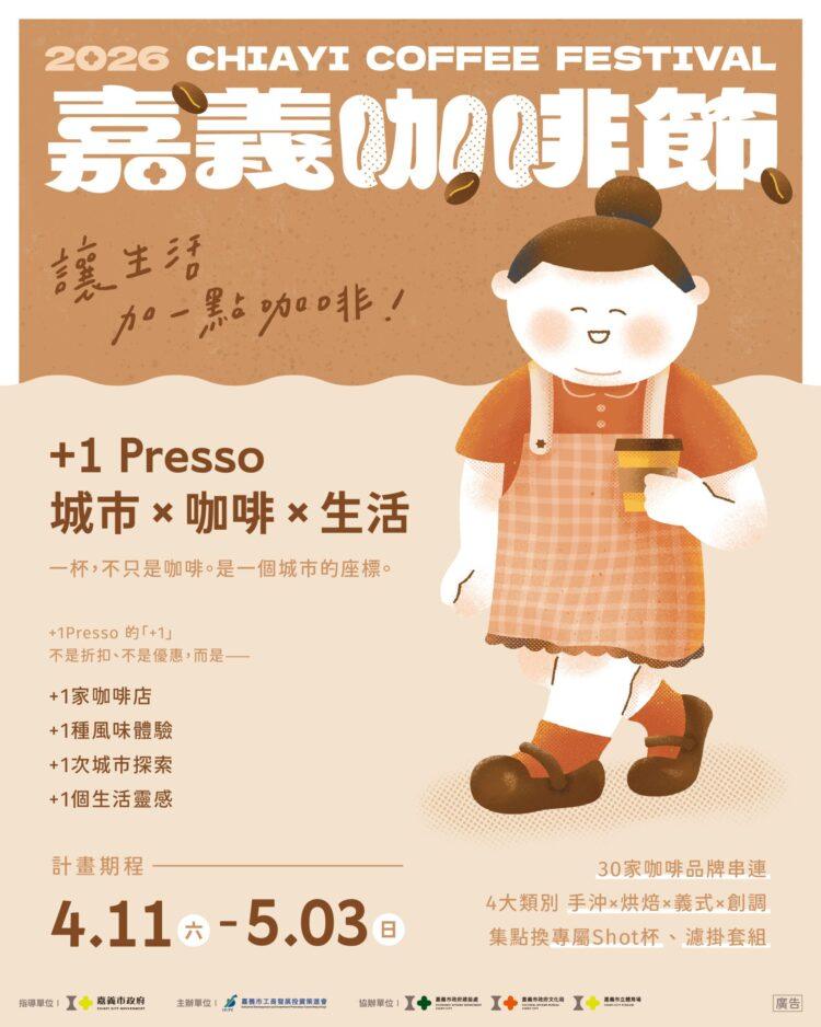 嘉義市工商發展投資策進會自4月11日起推出「+1Presso 城市串聯計畫」,做為即將登場的「2026嘉義咖啡節」重要暖身企劃。該企劃串聯32家嘉義在地及衛星城市咖啡品牌,邀請民眾提前走進城市巷弄,透過跑店、集點與兌換限定好禮的方式,感受嘉義市深厚且多元的咖啡文化。