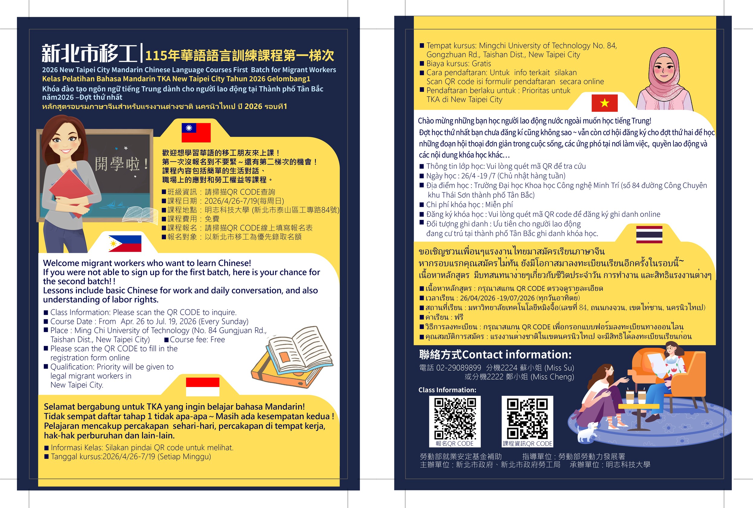 運用免費資源UP職場競爭力!新北市勞工局攜手明志科技大學,持續辦理免費華語課程,協助菲律賓、印尼、越南及泰國籍移工適應台灣環境,拓展職涯機會。課程分為基礎班與進階班,包含生活會話、職場溝通及基礎閱讀。本年度將於 4月26日至7月19日,每週日在明志科大多功能語言教室教室上課,共計13週,歡迎雇主轉知移工朋友們踴躍報名。