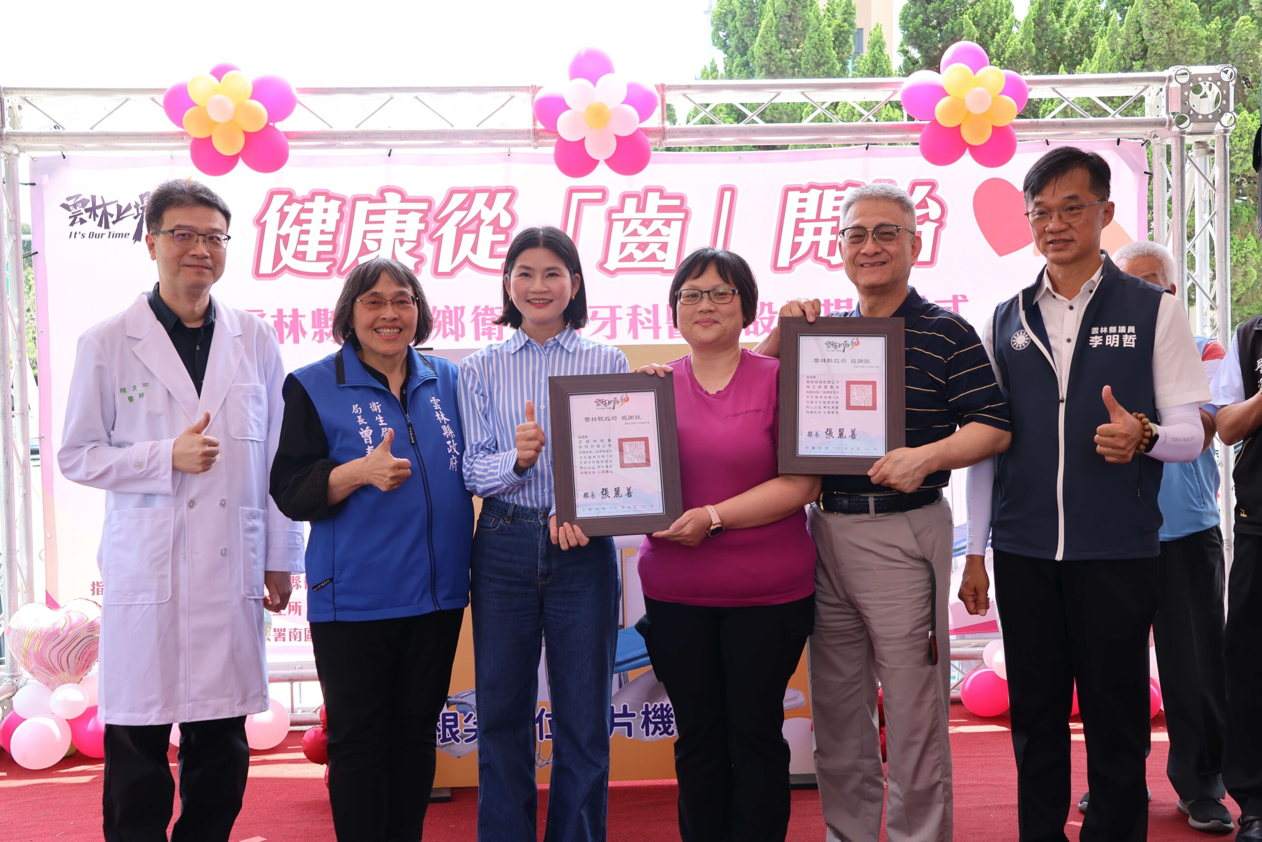 ▲副縣長陳璧君頒贈感謝狀予林董事長及廖書記官,肯定其回饋社會造福鄉里的善行義舉,為長期缺乏牙科看診服務的二崙鄉注入醫療新量能。(圖/雲林縣政府提供)