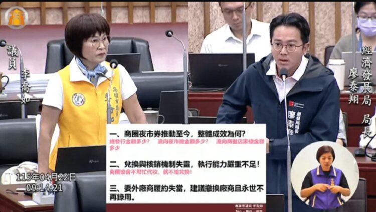 高雄市推動「商圈夜市券」原為振興演唱會經濟與地方消費的重要措施,但實施過程卻出現執行落差。高雄市議會4月22日財經委員會質詢中,市議員李喬如指出,核銷制度設計不當,已對商圈組織與第一線店家造成沉重負擔,要求經濟發展局儘速全面檢討。