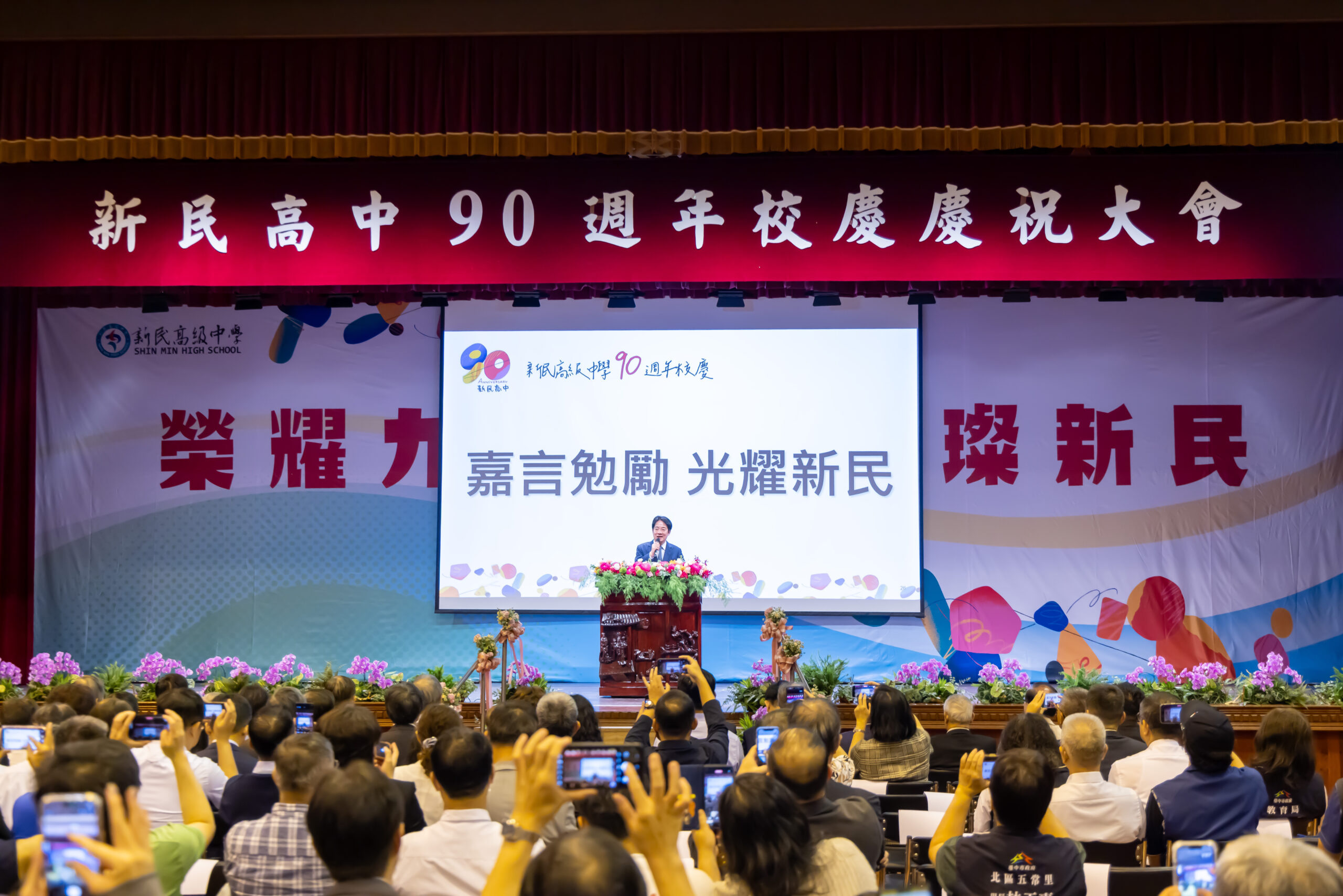 總統於致詞中表示,很榮幸能與新民高中一同見證90週年這歷史性時刻,並祝福學校校運昌隆。他指出,新民自1936年創校以來,由地方有志之士以知識、文化與民主理念興學,至今已培育無數人才,對臺中及臺灣發展具有重要貢獻。