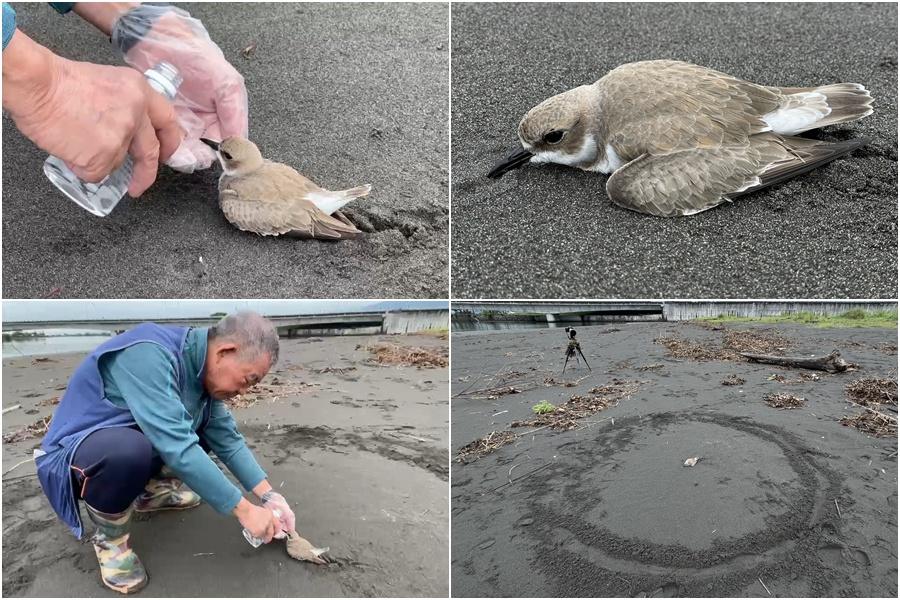 生態攝影師吳楊欽和陳永琛上午到竹安河口拍攝唐白鷺時,發現該隻東方環頸鴴幼鳥,一動也不動的癱軟在沙灘上,立即將牠救起,隨後送往消防分隊轉交動植物防疫所進一步照護及處理。