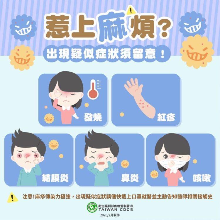 疾管署也呼籲,如曾有流行地區旅遊史,返國3週內出現發燒、紅疹、鼻炎、咳嗽、結膜炎等疑似麻疹症狀,請務必戴上口罩儘速就醫,並主動告知醫師旅遊及暴露史。另如與確診個案有相關接觸史,或已經地方衛生局通知為接觸者,請務必遵循「麻疹個案接觸者健康監測通知書」所示,確實做好健康監測及防護措施,如出現疑似症狀,應戴上口罩並自我隔離,儘快聯繫衛生局安排就醫,切勿輕忽或自行就醫,若未遵守自主健康管理規範者,依傳染病防治法第48條及同法第67條規定可處新臺幣6至30萬元罰鍰。