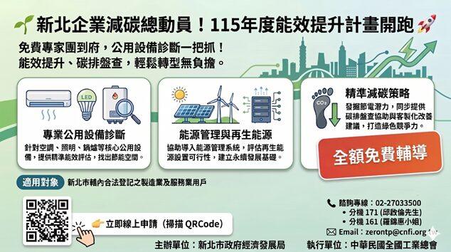 廣受企業好評的「新北Net Zero碳健檢中心」今(115)年持續提供服務,協助企業盤點碳排與節能潛力,誠摯邀請有減碳規劃與淨零轉型的企業至經發局網站查詢「新北Net Zero碳健檢中心」,或加入Line官方帳號(ID:@375iiswo)預約諮詢,與新北市攜手邁向淨零永續未來。